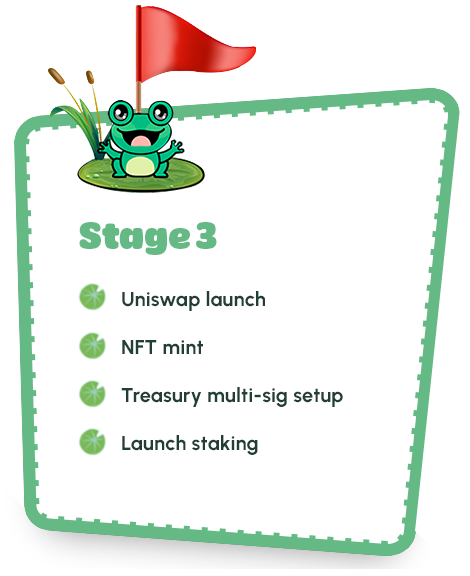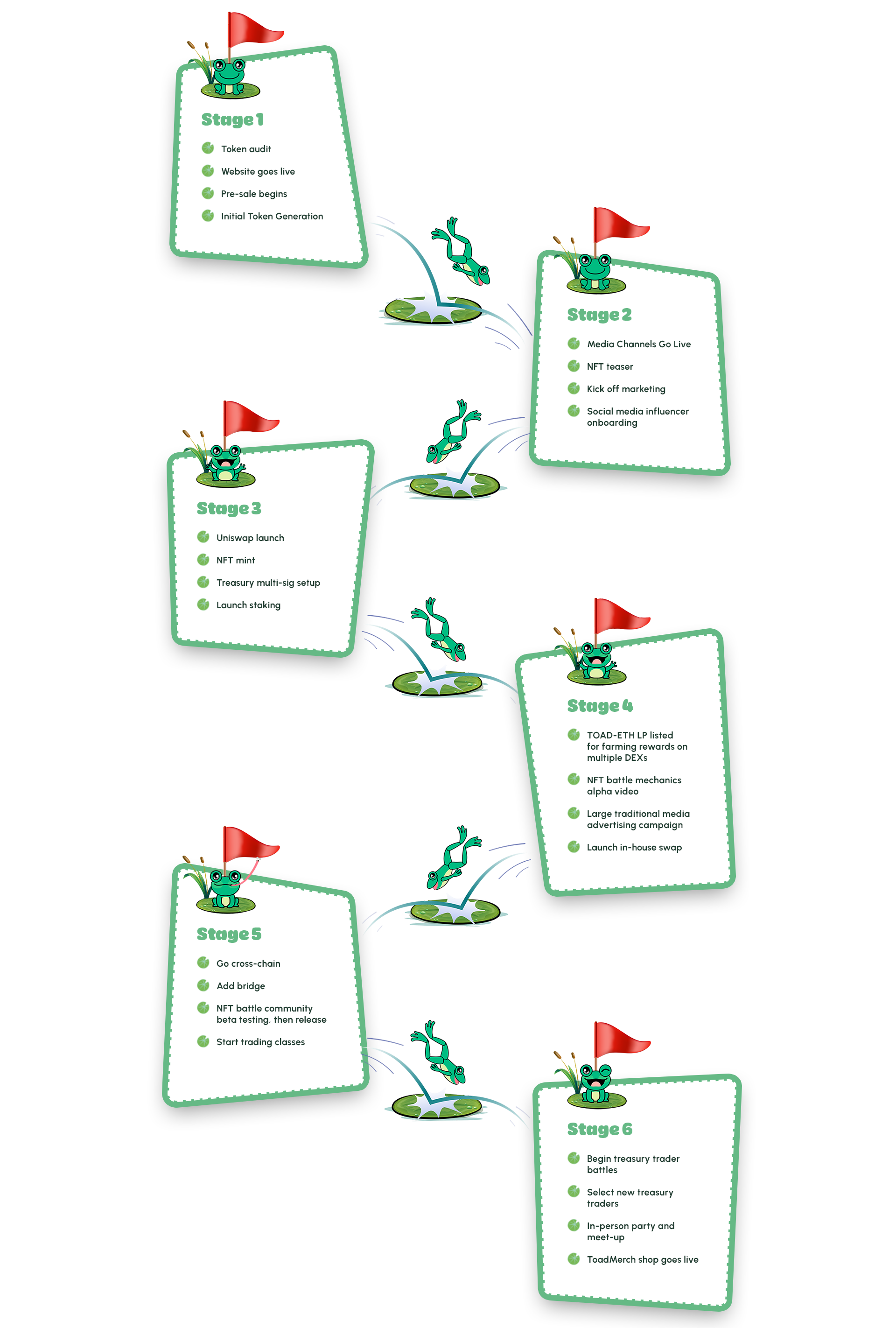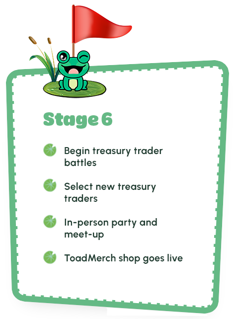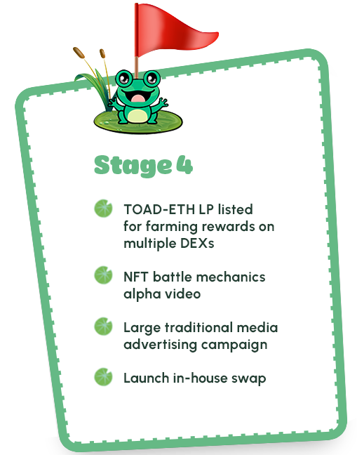 The Treasury also plays a role in stocking up the staking pool, supporting TOAD’s constantly deflationary model, furthering development, and keeping the liquidity pool topped up to ensure users can join and leave the swamp freely!